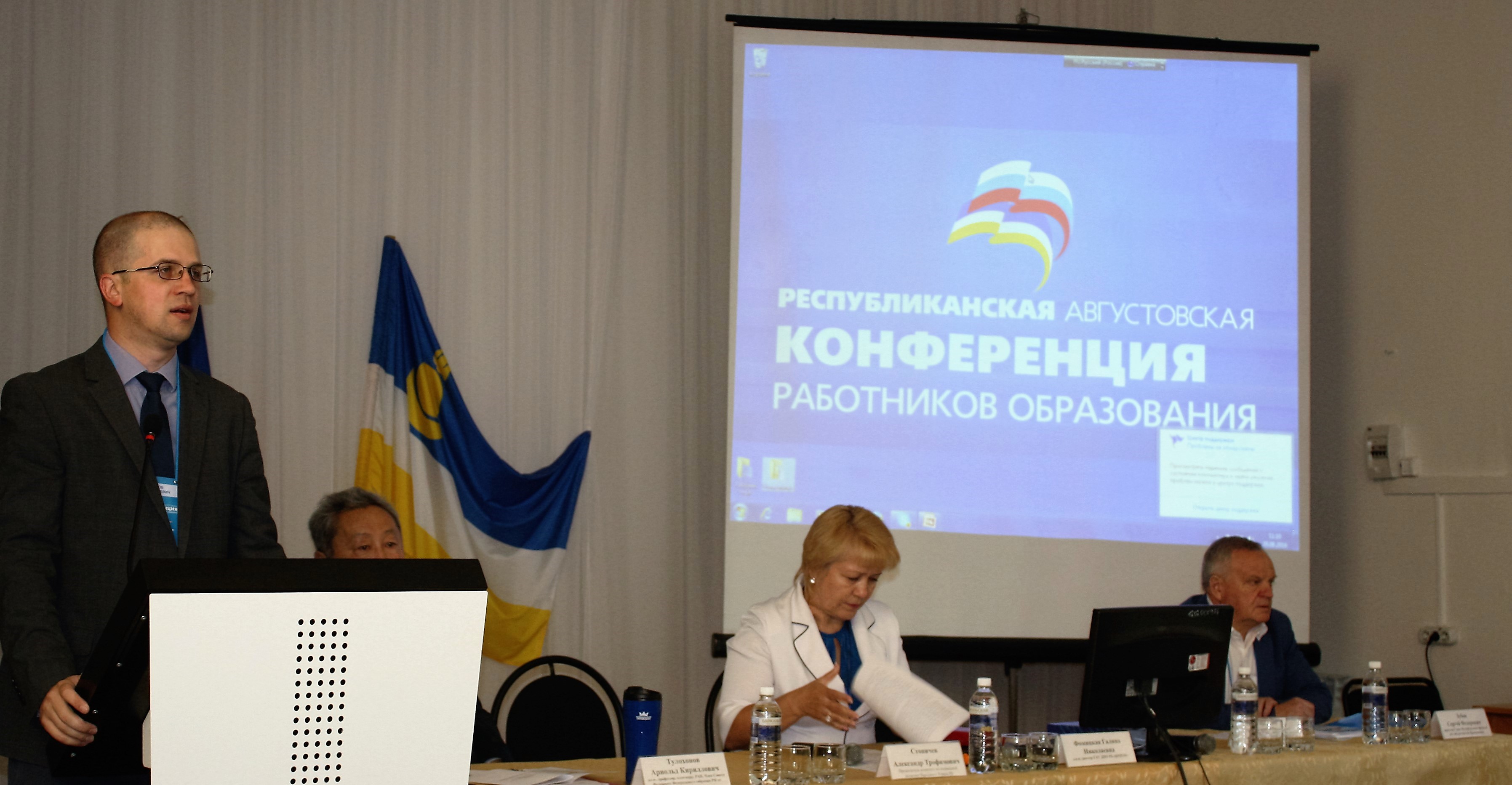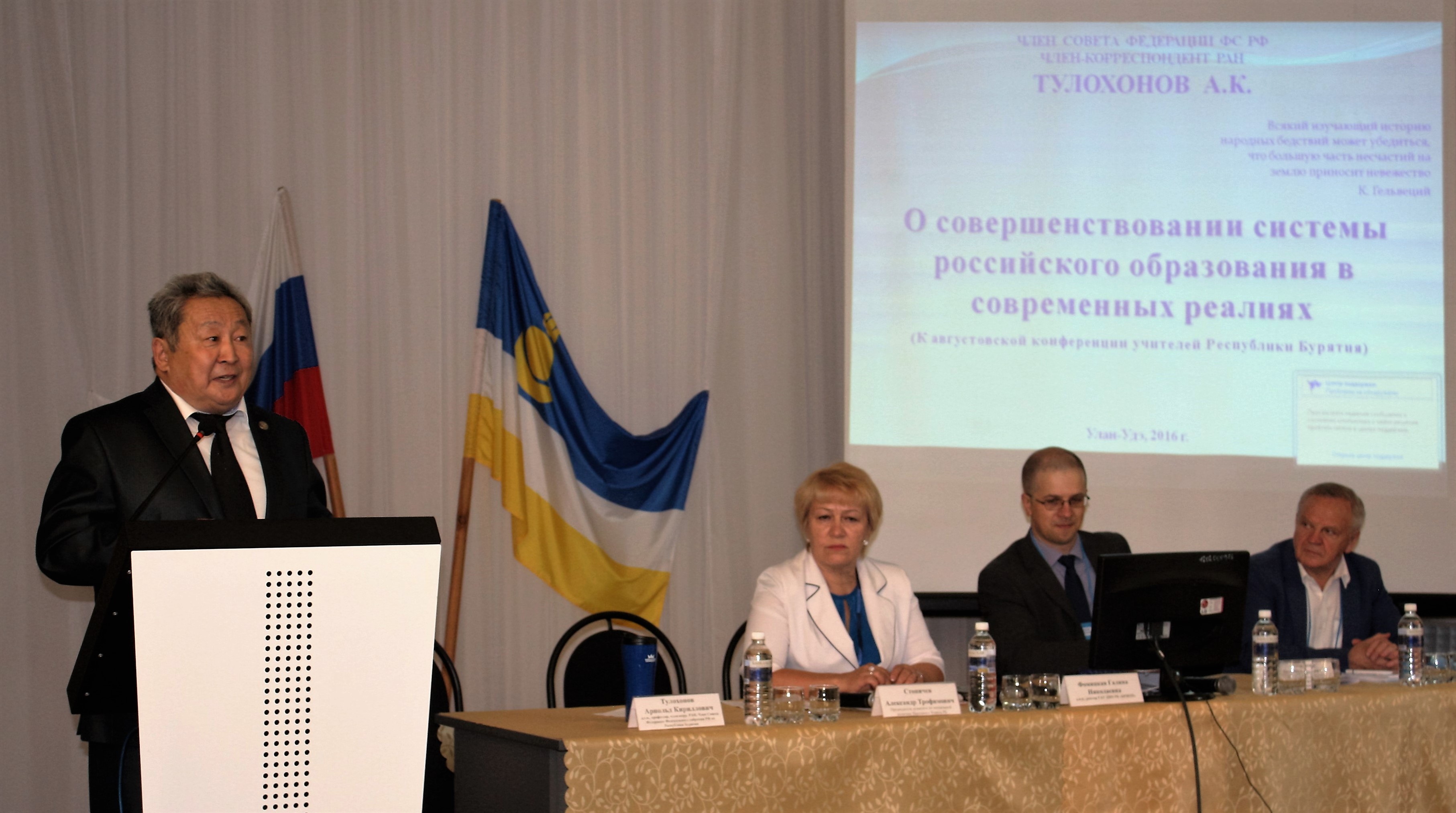 Работу конференции начал Арнольд Тулохонов, д.г.н., профессор, член Совета Федерации Федерального собрания РФ с докладом «О совершенствовании системы российского образования в современных условиях», в котором отметил роль Петра Столыпина в российском образовании, провел экскурс в образование царской России и Советского Союза, упомянул о важности таких предметов, как география, история, литература. Говоря о реформах новой России, отметил, что рейтинг читательской грамотности России составляет 43 место, 36% россиян не читают вообще. Выразил свое отрицательное отношение к ЕГЭ, так как ЕГЭ – это стресс для учеников, увеличение количества суицидов, вымывание талантливых детей из деревни в центр. Анализируя итоги реформы образования в РФ, отметил ее негативные последствия, такие как разрушение лучшей в мире советской системы образования; выезд за границу сотен тысяч высококвалифицированных специалистов, отъезд талантливой молодежи из села в город, далее в центральные города и отъезд их родителей; сокращение 400 неэффективных вузов; наличие двух обязательных предметов; школа как время для подготовки к поступлению в ВУЗ; создание индустрии репетиторства; отсутствие единого последнего звонка, единого выпускного вечера; попытка упразднить золотые медали; огромные затраты на проведение ЕГЭ; 3 тыс. учебников не могут обеспечить общее образование.