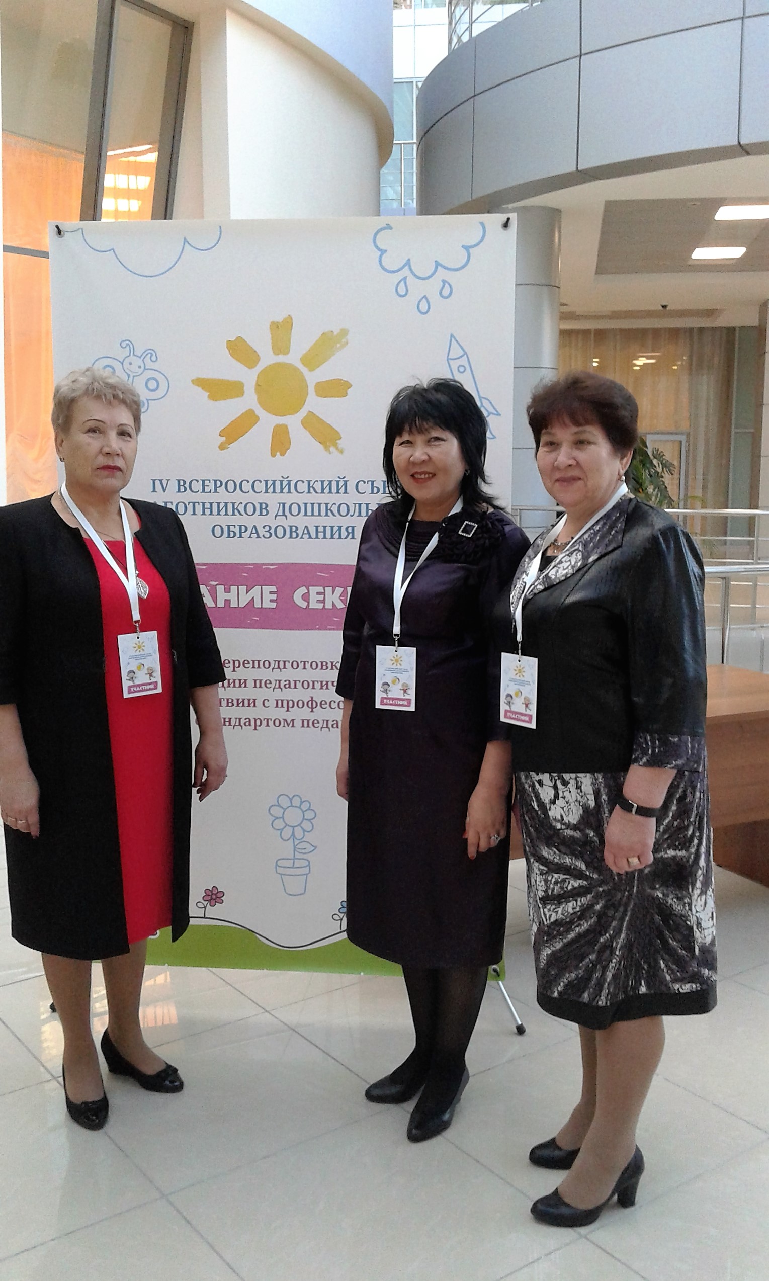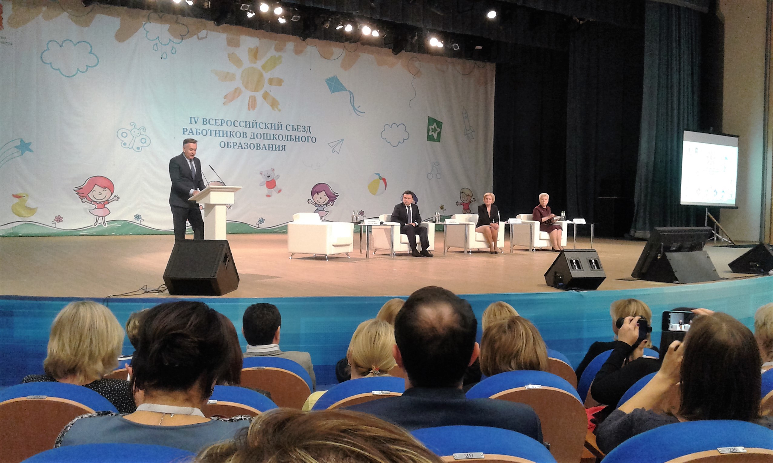 24-25 октября 2016 года в г. Красногорске Московской области состоялся IV Всероссийский съезд работников дошкольного образования. В работе съезда приняли участие Ольга Голодец, заместитель Председателя Правительства РФ, Андрей Воробьев, губернатор Московской области, Ольга Васильева, министр образования и науки РФ, Людмила Вербицкая, президент Российской академии образования, Татьяна Волосовец, профессор, директор ФГБНУ «Институт изучения детства, семьи и воспитания РАО», Ирина Абанкина, профессор, директор Института развития образования НИУ «Высшая школа экономики», Петр Положевец, главный редактор «Учительской газеты», а также 1066 специалистов дошкольного образования из 85 регионов Российской Федерации, почётные гости, ученые, представители бизнеса и родительской общественности. В качестве делегатов съезда от Республики Бурятия были направлены Раиса Карпова, старший преподаватель кафедры развития образовательных систем ГАУ ДПО РБ «БРИОП», Валентина Кривогорницына, заведующая МАДОУ «Березка» п. Иволгинск, Валентина Орлова, заведующая МБДОУ №47 г. Улан-Удэ.