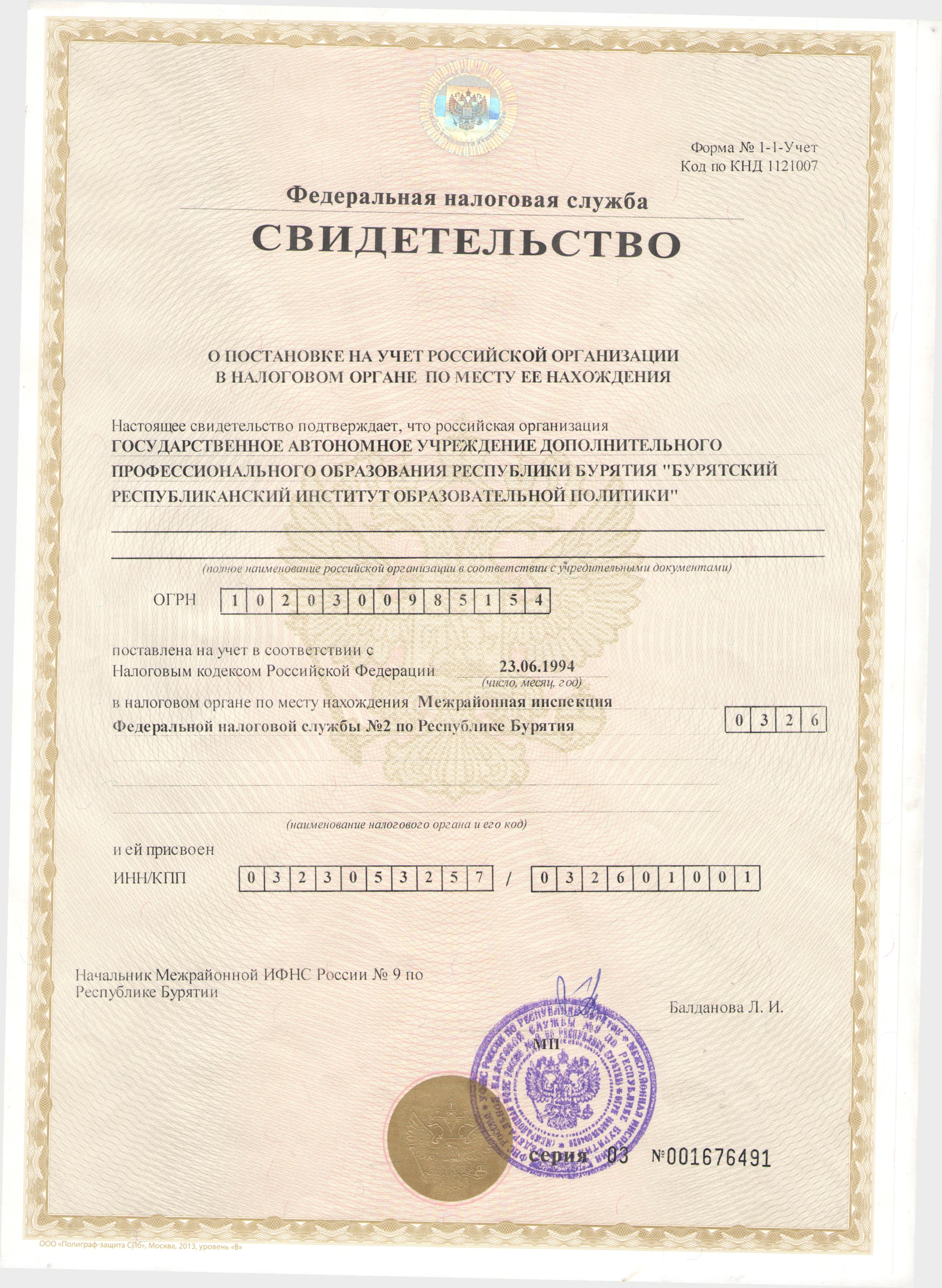 • СВИДЕТЕЛЬСТВО О ПОСТАНОВКЕ НА УЧЕТ РОССИЙСКОЙ ОРГАНИЗАЦИИ В НАЛОГОВОМ ОРГАНЕ ПО МЕСТУ ЕЕ НАХОЖДЕНИЯ