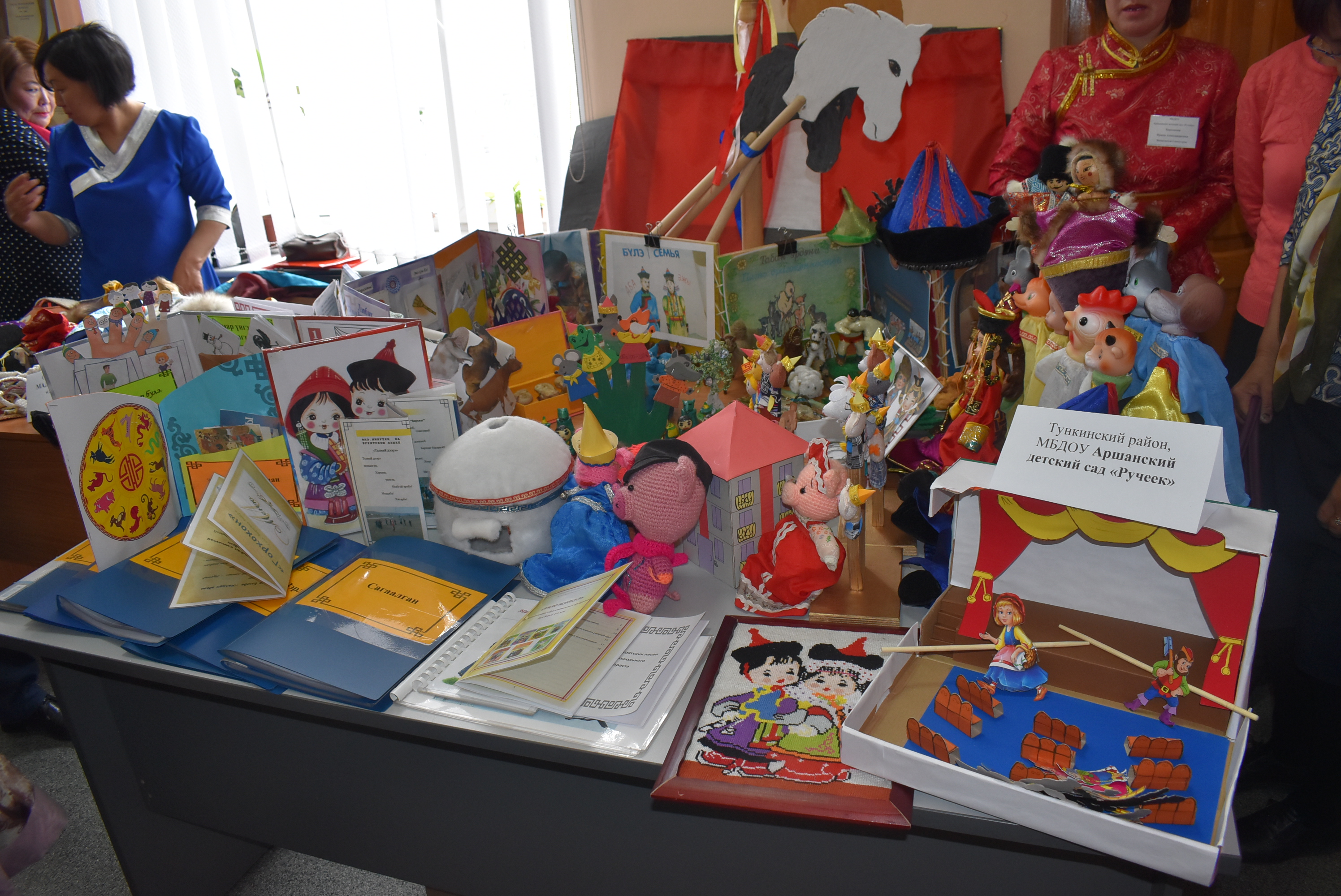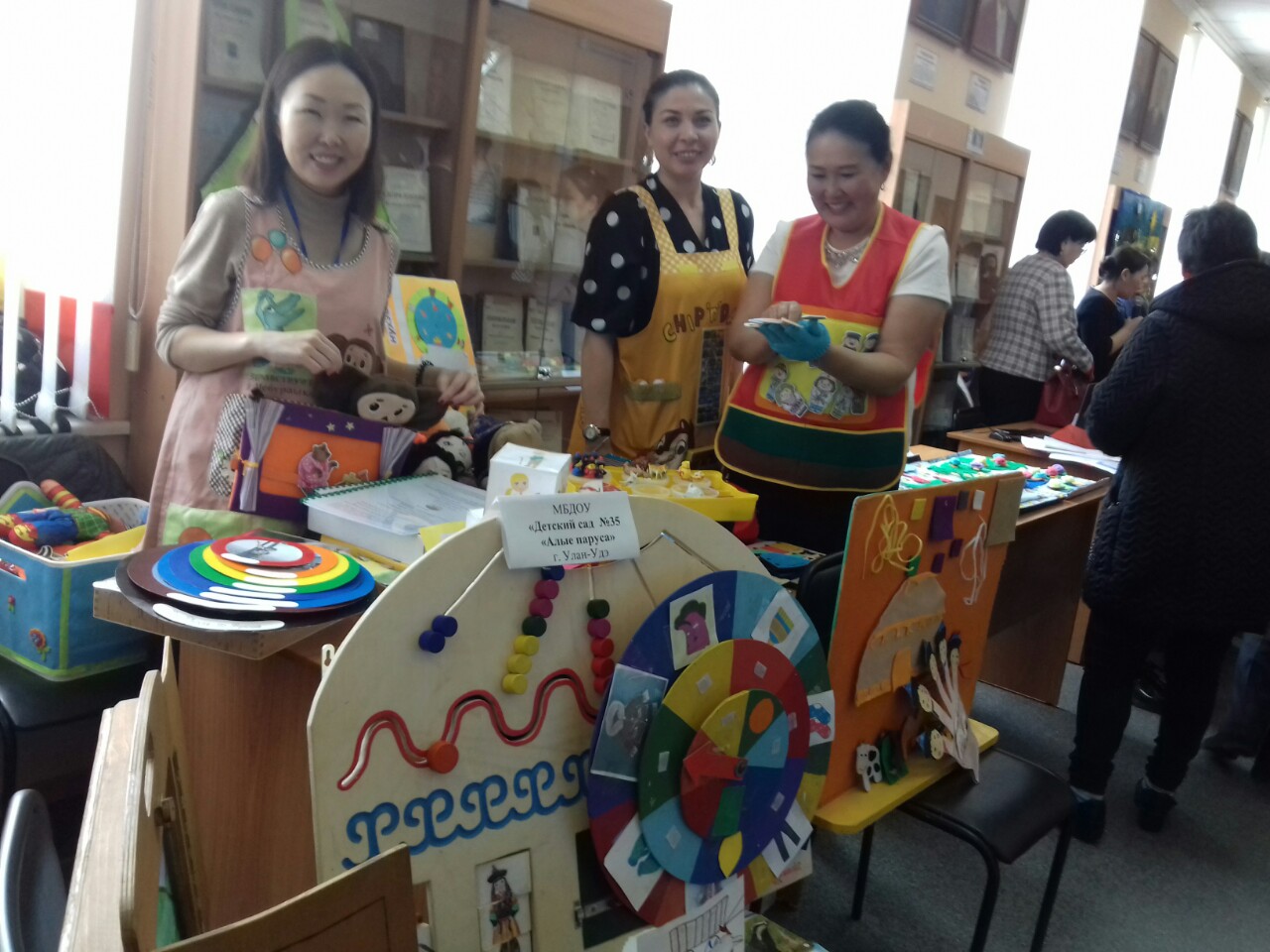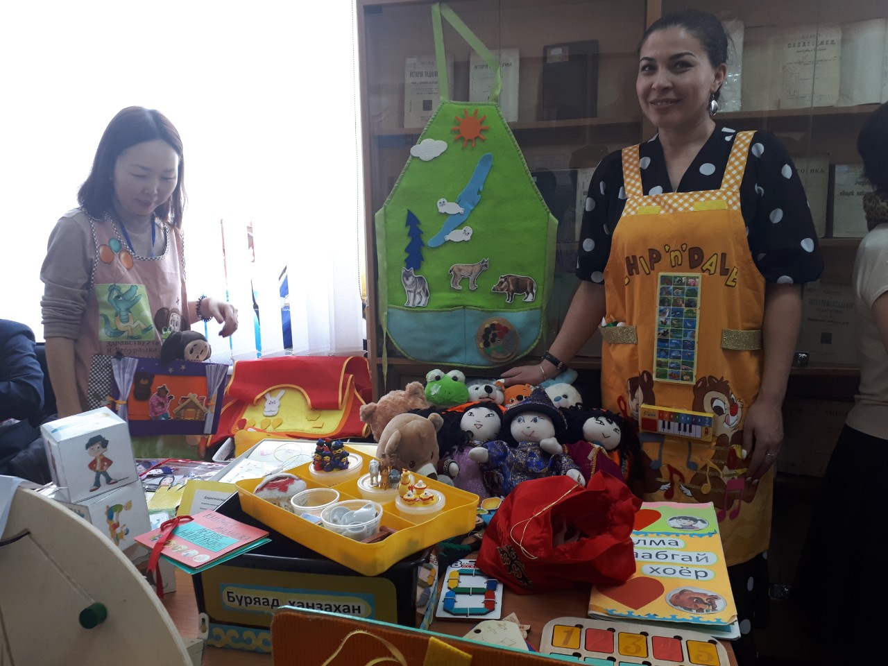 В фойе второго этажа БРИОП была развернута зрелищная и яркая выставка наглядных средств обучения бурятскому языку, развития родной бурятской речи дошкольников, которая дала возможность оценить творческий подход и креативные идеи, в целом методический потенциал учителей бурятского языка, педагогов дошкольного образования республики.