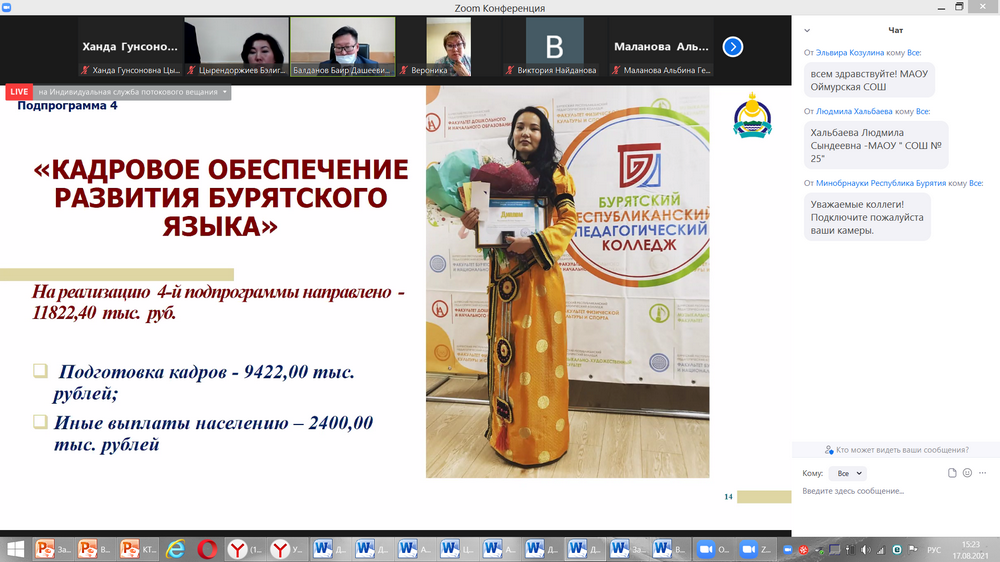 Туяна Тугутова, заведующий отделом научно-методической работы ГБПОУ «Колледж традиционных искусств народов Забайкалья» поделилась опытом работы по теме «Бурятский язык в среднем профессиональном образовании: состояние, проблемы тенденции».