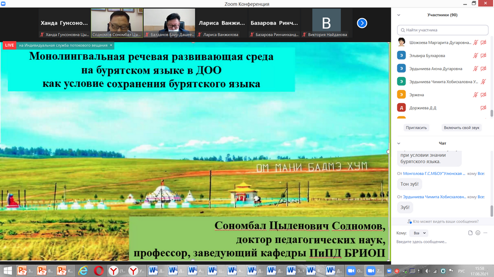 Д. пед. н., проф. ГАУ ДПО РБ «БРИОП» Сономбал Содномов в своем выступлении выдвинул на обсуждение и обосновал новый взгляд на обучение родной бурятской речи в детских садах республики: «Монолингвальная речевая развивающая среда на бурятском языке в ДОО как условие сохранения бурятского языка». К числу достоинств данной модели, по мнению д.п.н., проф. С. Содномова, относится создание монолингвальной речевой развивающей среды на бурятском языке в ДОО республики.