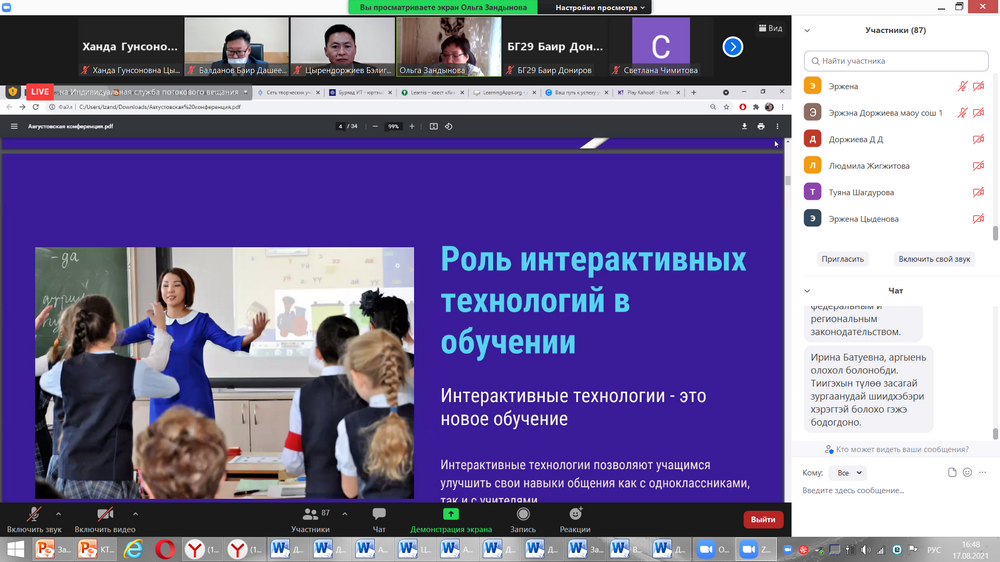 Большой интерес у участников августовской конференции вызвала актуальная тема Лхамажап Зандыновой, старшего преподавателя кафедры педагогики и психологии детства ГАУ ДПО «БРИОП» «О возможностях использования электронно-информационных ресурсов на уроках бурятского языка и литературы», в которой был представлен опыт использования Google – cервисов на уроках бурятского языка и литературы, были представлены примеры создания образовательных квизов, тестов при помощи интерактивных средств Classtime, Kahoot, создания литературных квестов в программе Learnis и т.д. Также были показаны первые результаты работы кафедры по внедрению цифровых образовательных технологий в обучении бурятскому языку в ДОУ.