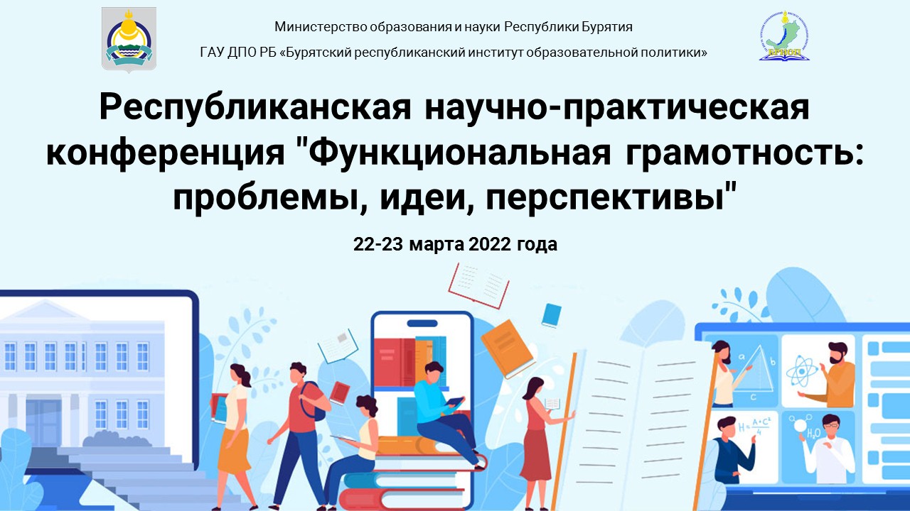 22-23 марта 2022 года ГАУ ДПО РБ «Бурятский республиканский институт образовательной политики» приглашает педагогических работников общеобразовательных организаций, профессиональных образовательных организаций, руководителей ОО и методистов муниципальных методических служб принять участие в республиканской научно-практической конференции «Функциональная грамотность: проблемы, идеи, перспективы». Конференция проводится на платформе Zoom. Слушатели могут присоединиться к конференции в режиме YouTube-трансляций. Ссылки на каждую секцию, программы работы секций опубликованы на сайте конференции https://sites.google.com/view/funcg.