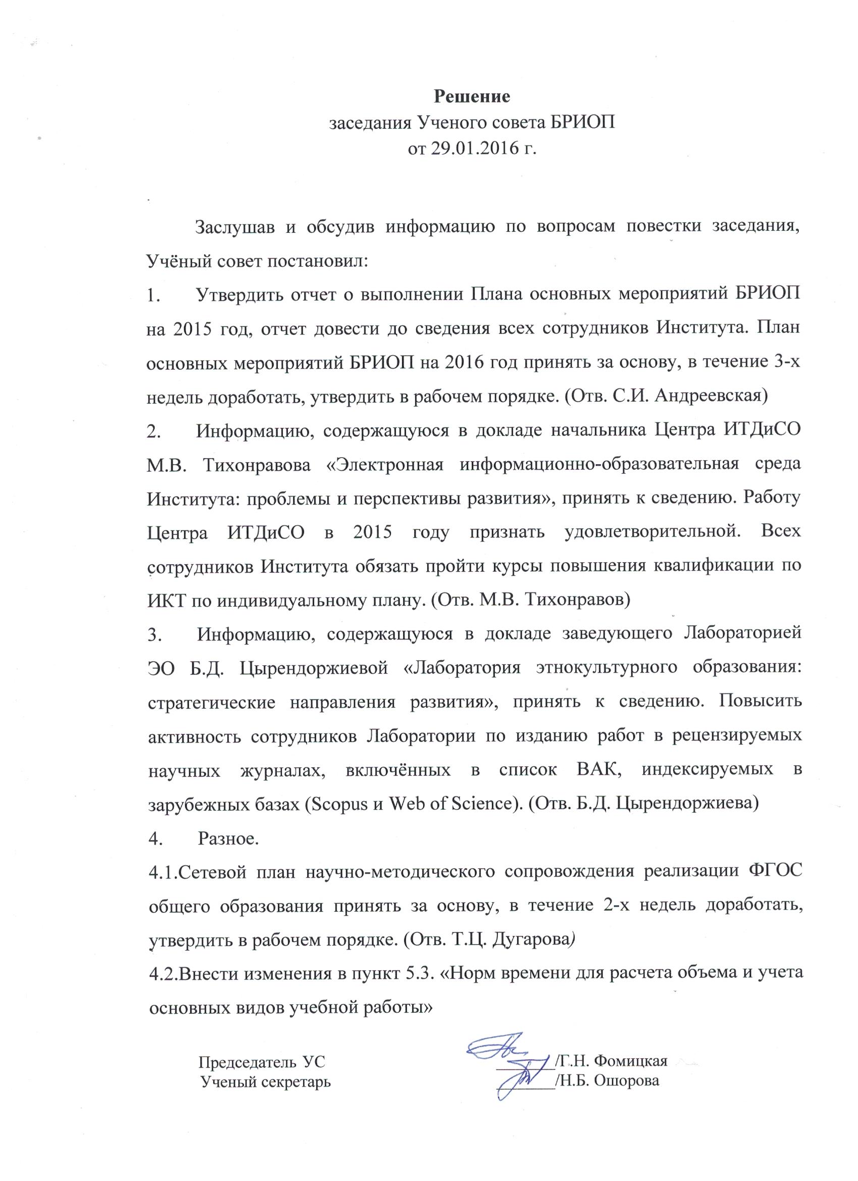 Решение заседания №5 от 29.01.2016 г.