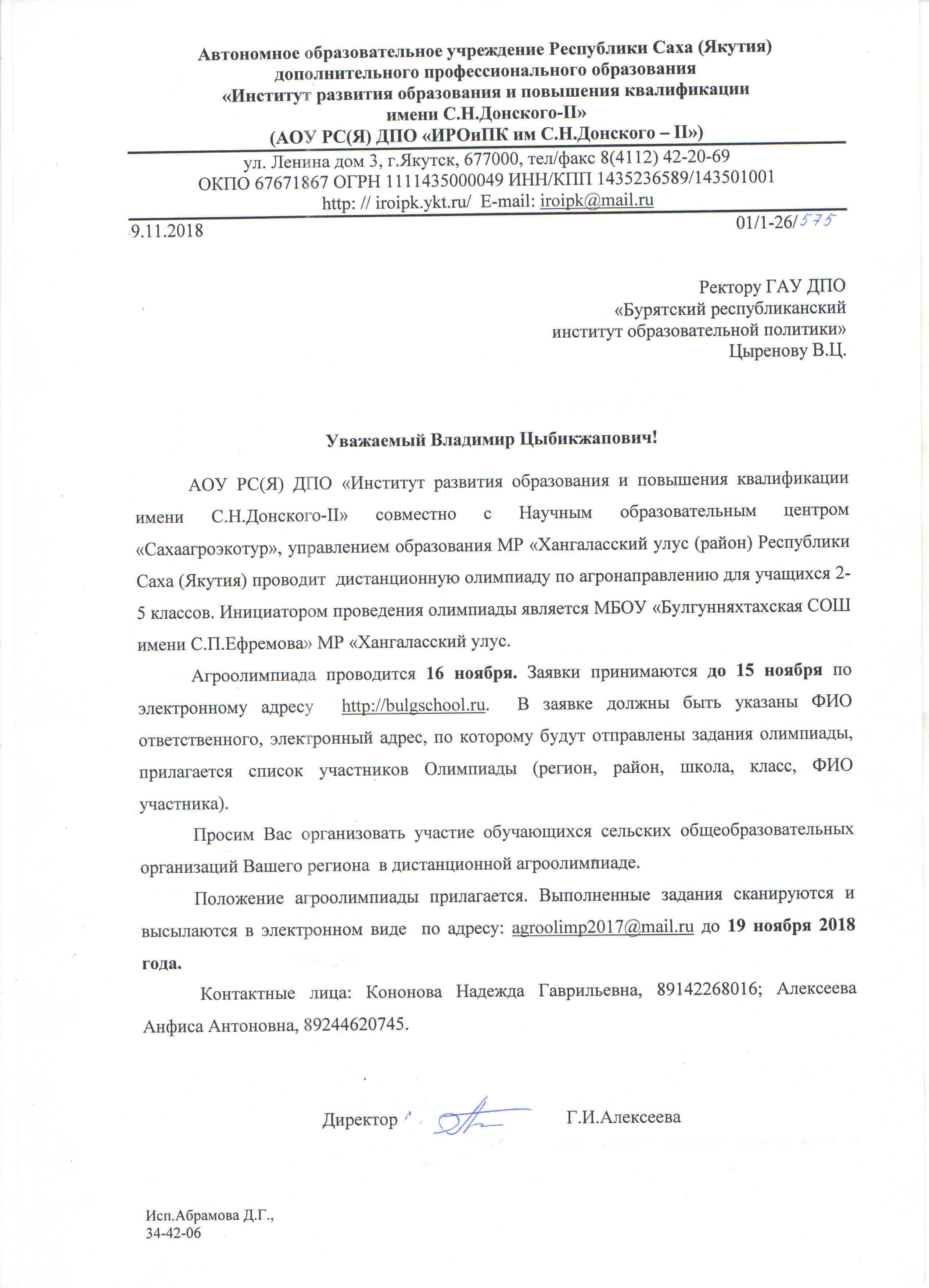Доводим до Вашего сведения, что АОУ Республики Саха (Якутия) ДПО «Институт развития образования и повышения квалификации имени С.Н.Донского-П» совместно с Научным образовательным центром «Сахаагроэкотур», управлением образования МР «Хангаласский улус (район) Республики Саха (Якутия) проводит дистанционную олимпиаду по агронаправлению для учащихся 2- 5 классов. Инициатором проведения олимпиады является МБОУ «Булгунняхтахская СОШ имени С.П.Ефремова» МР «Хангаласский улус.