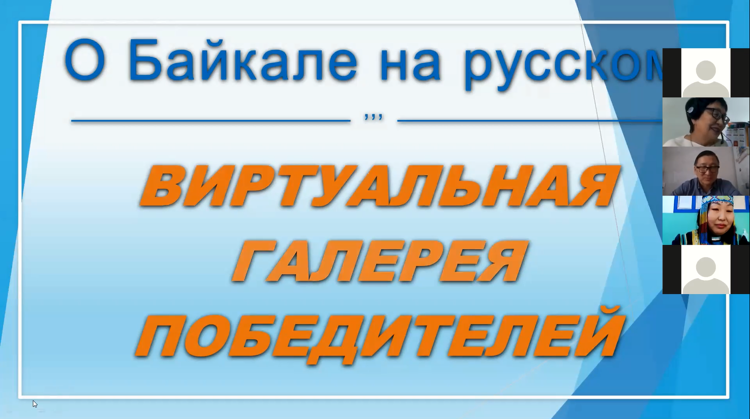Была продемонстрирована виртуальная галерея победителей по итогам онлайн-олимпиады «Знаете ли вы русский язык?», викторины «Загадки Байкала», мини-сочинений «Если бы я жил (а) на берегу Байкала…».