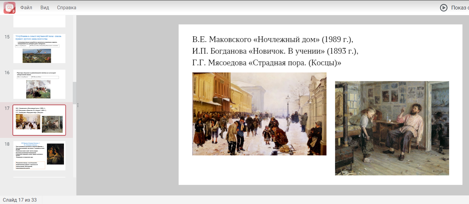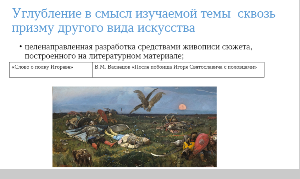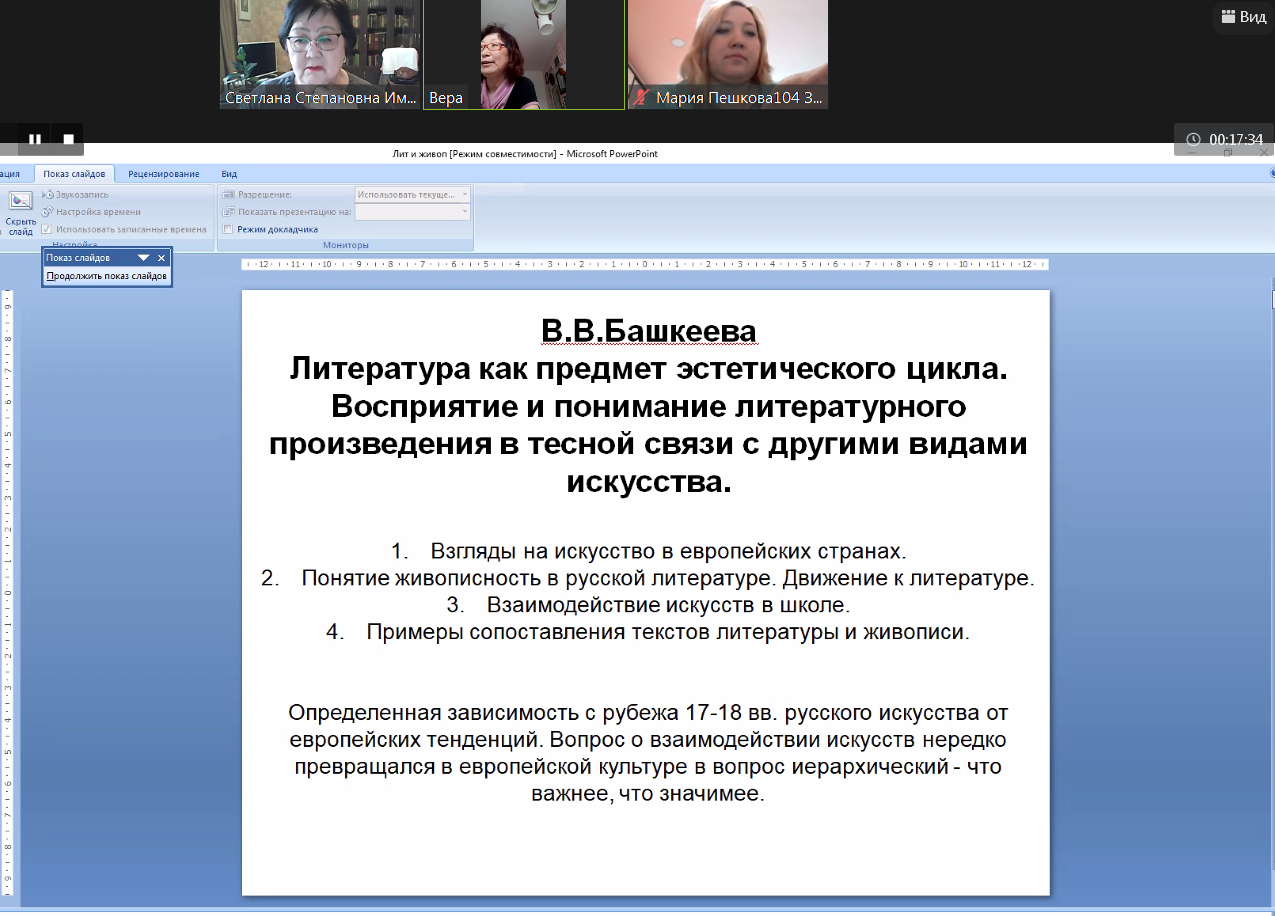 С.С. Имихелова познакомила с опытом практического применения таких инновационных технологий, как эвристическое обучение, педмастерские творческой деятельности, обучающее тестирование, в частности, показав их на примерах сопоставления «языка» литературного произведения с языком других искусств. Указала на то, что в разговоре об экранизациях, театральных постановках, живописных полотнах, музыкальных иллюстрациях учителю-словеснику всегда необходимо подчеркивать господство литературы как особой формы эстетического отношения к миру.