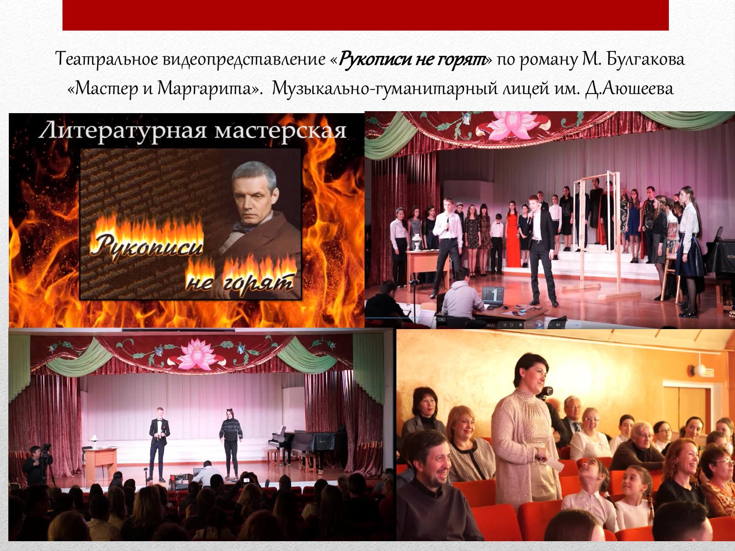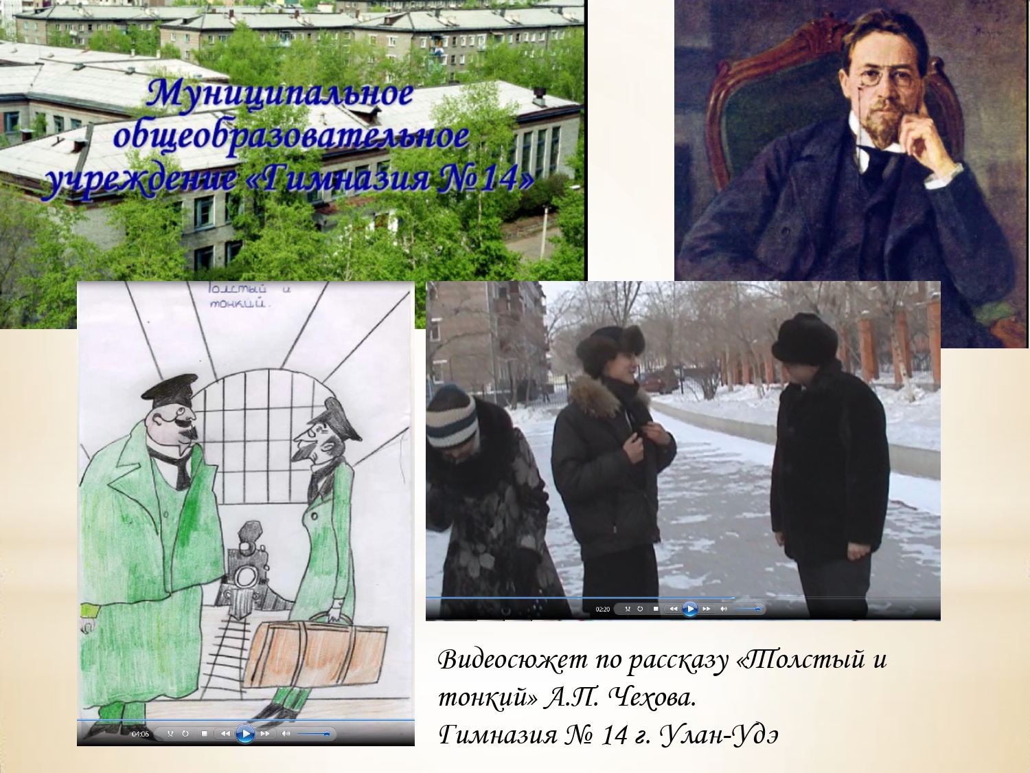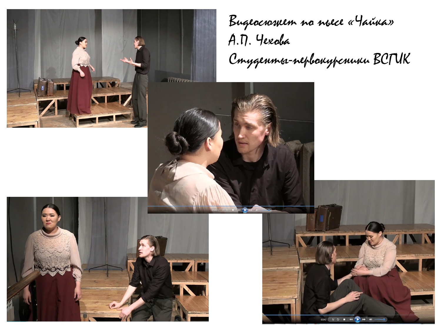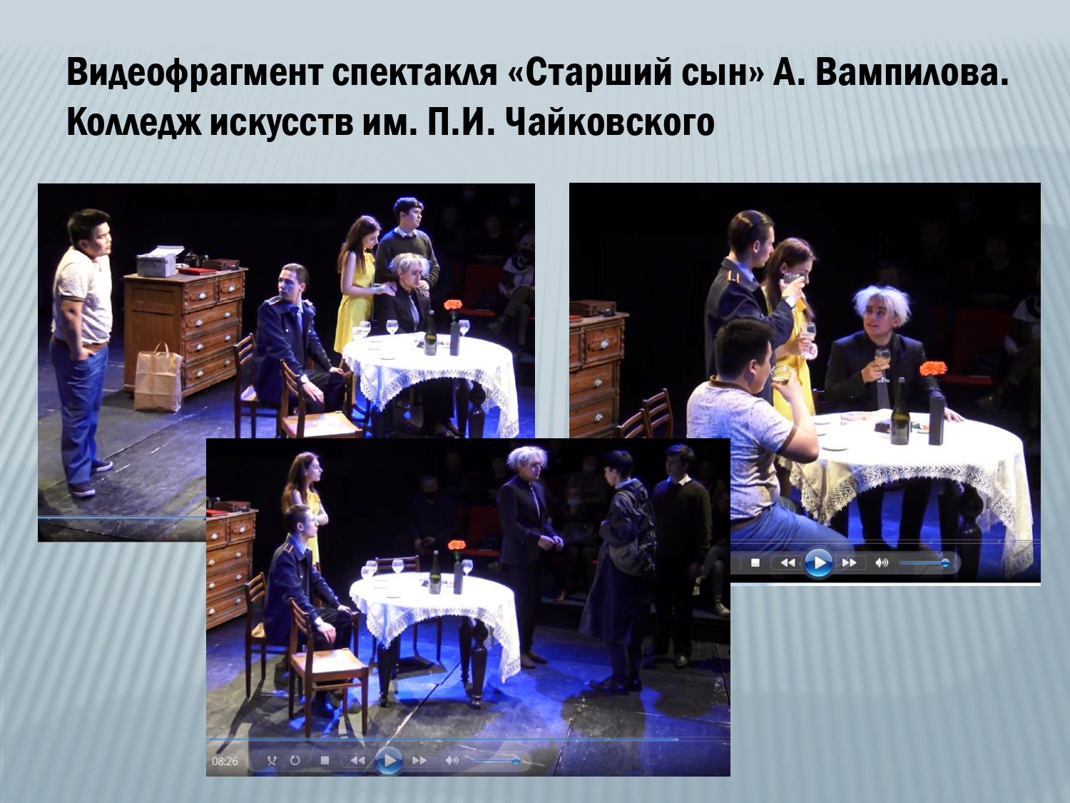 Для обсуждения были представлены видеоматериалы театрализованных представлений, проведенных в разные годы учащимися школ и других образовательных учреждений: видеофрагменты театрального урока-путешествия по пьесе А.П. Чехова «Вищневый сад» с участием 11-классников школы № 2 в рамках проекта Молодежного театра г. Улан-Удэ; видеофрагмент спектакля «Старший сын» по пьесе А. Вампилова студентов 1 курса Колледжа искусств им. П.И. Чайковского; театральный видеоролик по рассказу А.П. Чехова «Толстый и тонкий» с участием учащихся гимназии № 14; театральная видеокомпозиция по роману М.А. Булгакова «Мастер и Маргарита» в исполнении коллектива Музыкально-гуманитарного лицея им. Д. Аюшеева.