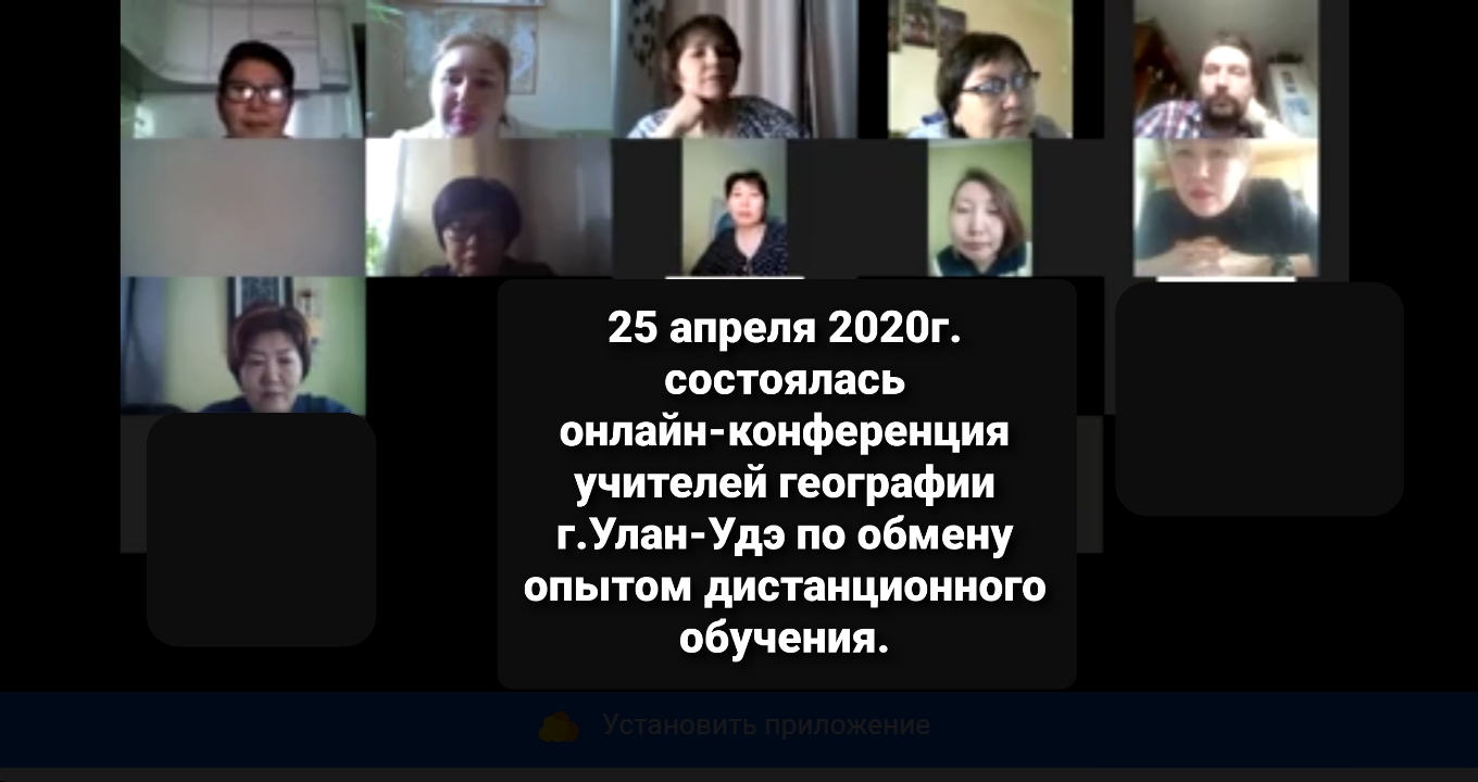 25 апреля 2020 г. прошла онлайн – конференция учителей географии по обмену опытом преподавания в условиях дистанционного обучения. Модератором конференции выступила Снежана Тулухеева, доцент кафедры естественно-математических дисциплин ГАУ ДПО РБ «БРИОП». Согласно программе первый спикер Елена Таряшинова, методист детского технопарка «Кванториум» познакомила участников с существующими инструментами дистанционного обучения. Опытом использования различных интернет-ресурсов на уроках географии поделилась Анна Пляскина, учитель географии МАУ «Гимназия 14» г. Улан-Удэ. Оксана Жамбалова, учитель высшей квалификационной категории ГБОУ «Лицей - интернат 61» г. Улан-Удэ рассказала о разных формах закрепляющих заданий с использованием созданных учениками видео, а также рассказа о интересных авторских ресурсах по отдельным темам. В работе конференции также приняли участие представители высшей школы Республики Бурятия: Сэндэма Ширапова , доцент БГФГБОУ ВО «БГУ», Владимир Бабиков, доцент БГФГБОУ ВО «БГУ».